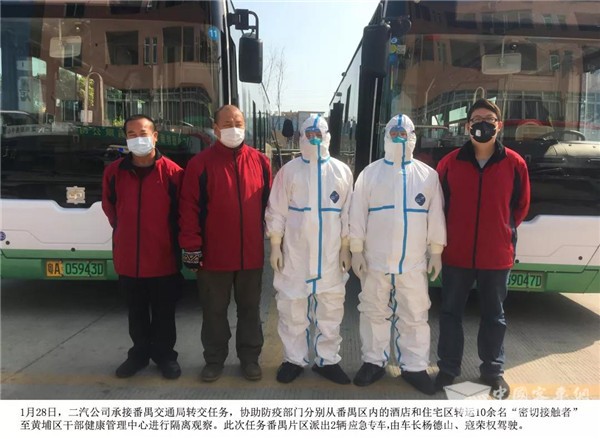 1月30日,二汽公司承接番禺交通局转交任务,派出1辆应急运输专车,协助防疫部门将5名外出旅游回国的武汉人转运至指定地点;