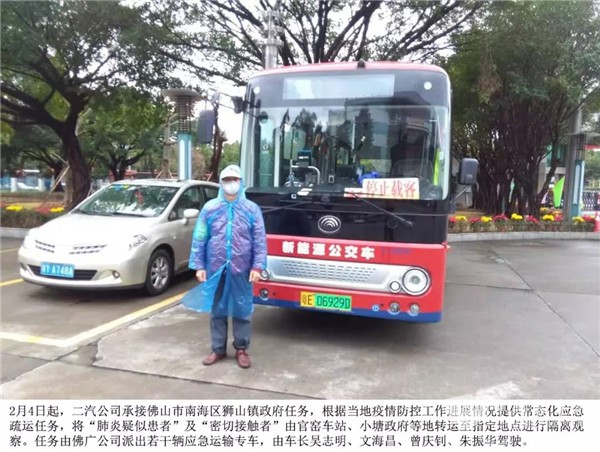 2月4日起,二汽公司承接佛山市南海区狮山镇政府任务,根据当地疫情防控工作进展情况提供常态化应急运输任务,将“肺炎疑似患者”及“密切接触者”转运至指定地点进行隔离观察;