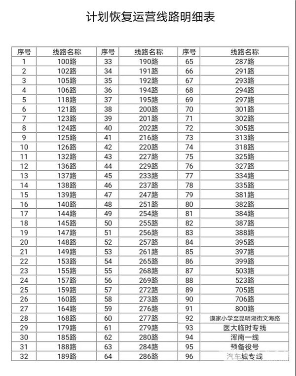 (一)2月10日0时起,恢复100路、102路等96条公交线路运营(详见附表)。