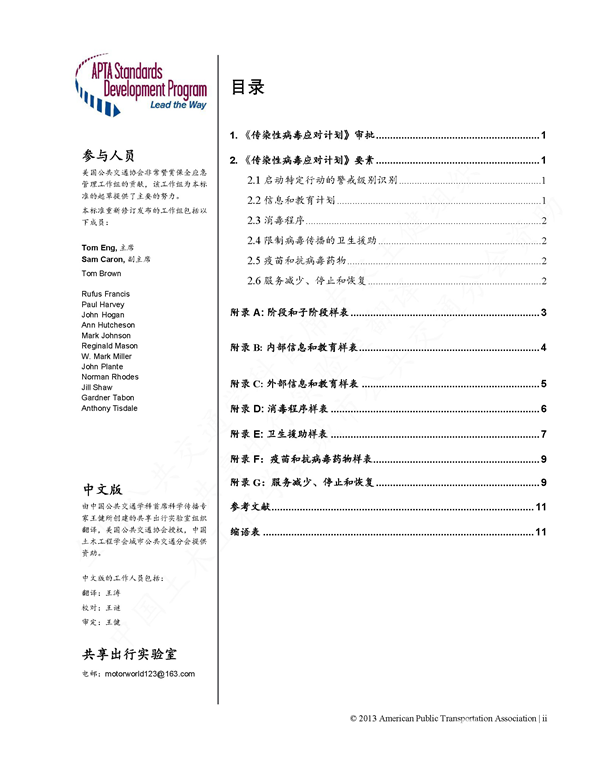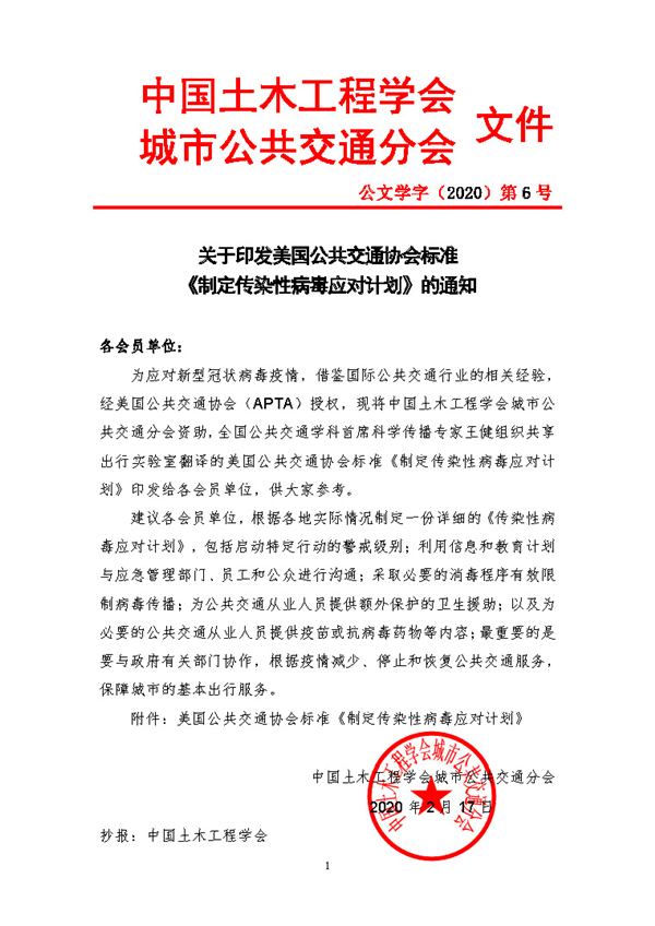由全国公共交通学科首席科学传播专家王健组织共享出行实验室翻译的美国公共交通协会(APTA)标准《制定传染性病毒应对计划》(Developing a Contagious Virus Response Plan),在获得美国公共交通协会的中文版授权之后,已由中国土木工程学会城市公共交通分会印发全国公共交通行业各会员单位,并建议各会员单位根据各地实际情况制定详细的《新型冠状病毒应对计划》。有关部门的领导已肯定这项标准翻译工作的积极意义,他们认为:通过借鉴国际经验,对中国公共交通行业应对新型冠状病毒疫情具有一定的参考价值。