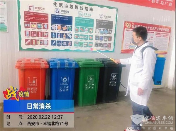 在第三保修厂车间外报修区停放着一辆刚检修完毕的公交车,小修班长杨永峰身穿白大褂、带着护目镜和口罩,全副武装地背着近40斤的电动喷雾器正在对车辆扶手、座椅、车门等乘客易接触的部位进行重点消杀,他说:“这是对该车的第二次消毒了,车辆维修前和交车前都要经过认真仔细消毒,不光是要保护好维修人员,也要为驾驶员和乘客负责。”