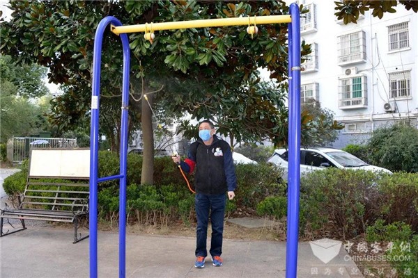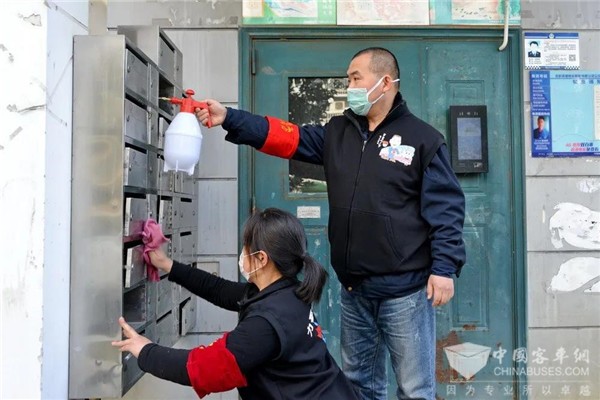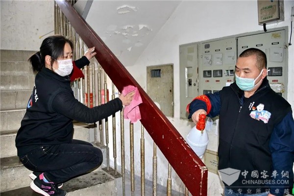 一旁的楼道里,张剑炜拎着喷壶给楼梯喷洒消毒液,胡益梅拿着抹布,认真擦拭楼梯扶手,正集中精力清理楼道环境卫生,并清除楼道里的塑料袋、小广告。一个单元楼道完成清洁工作,他们来到下一个单元,又忙碌了一个多小时,随后转战小区休闲广场,对座椅、儿童游乐设施再次进行清洁消毒工作。与此同时,“力哥”志愿服务队成员、BRT3号线驾驶员杜宁身背喷雾器,对小区各栋居民楼前的垃圾桶逐一喷洒消毒液,严防垃圾集聚造成二次污染,帮助小区居民筑牢抗击疫情牢固防线。
