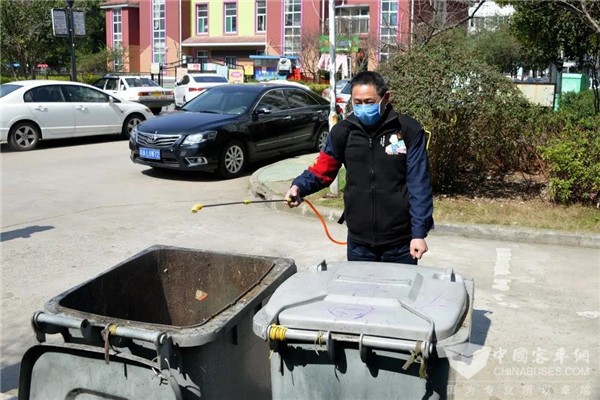 杜宁身背喷雾器,对小区各栋居民楼前的垃圾桶逐一喷洒消毒液,严防垃圾集聚造成二次污染,帮助小区居民筑牢抗击疫情牢固防线。