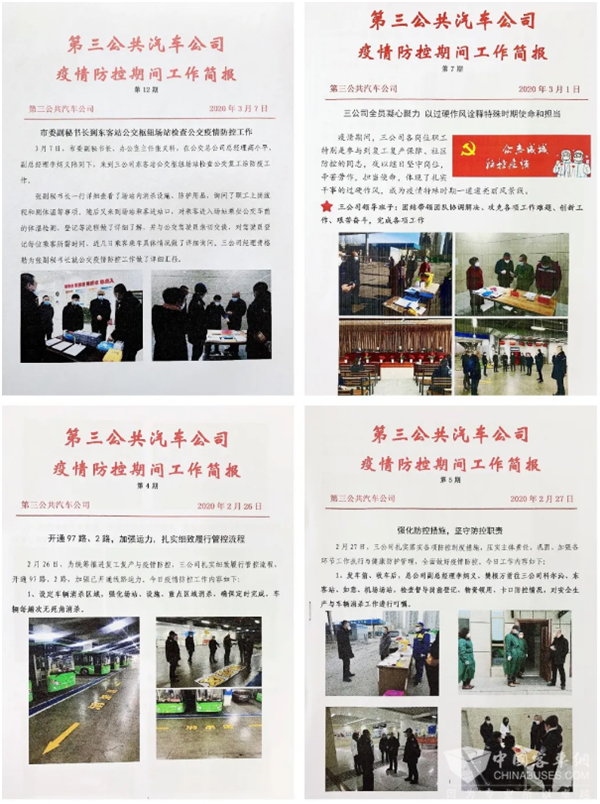 同时,将每日工作以简报形式记录,放置于各场站、卡口,在员工群发布,让领导、职工和乘客都能及时了解各项工作进行情况。简报内容包括三公司各项防控举措落实、领导督导检查、每日工作安排、各项工作要求、还包含三公司各岗位职工先锋事迹宣传,激励全体职工守土尽责,以高度政治责任感认真完成好疫情防控期间每一项工作。截至目前,三公司已发布十三期疫情防控期间工作简报。