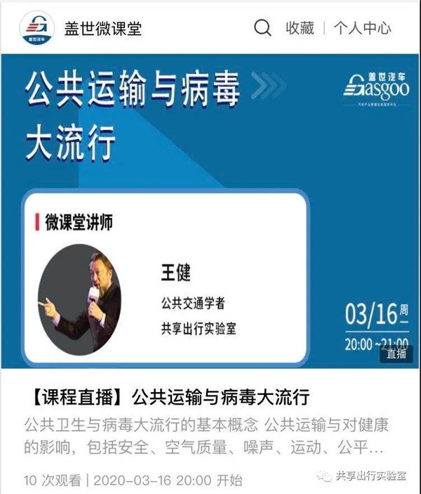 全国公共交通学科首席科学传播专家、共享出行实验室创建人王健,应《盖世汽车微课堂》的邀请,将于2020年3月16日(星期一)晚上8-9点,主讲《公共运输与病毒大流行:应对新冠病毒病的科学原则》,欢迎在线观看并现场提问进行交流。