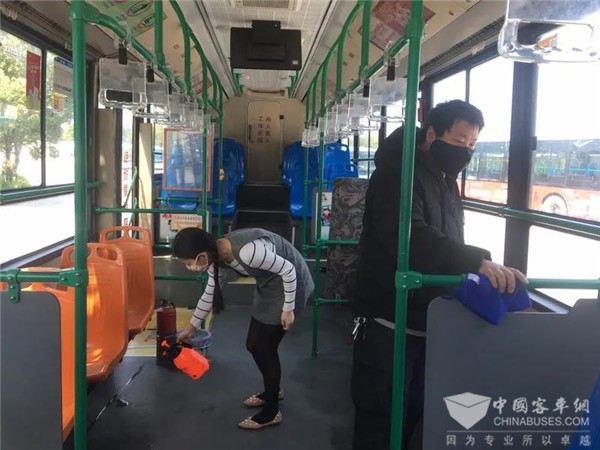 3月16日,快6路驾驶员游圣兴主动放弃休息,协同妻子为自己的爱车进行清洁消毒,对车厢内卷边的张贴物再加固。