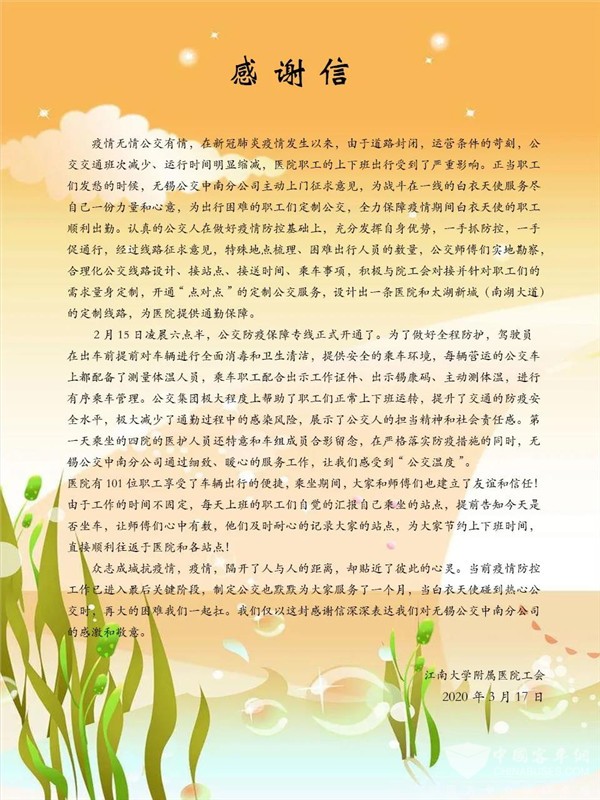 3月17日,中南分公司党总支副书记(主持工作)顾毓新的手机里收到了江南大学附属医院工会一封暖心的感谢信,感谢集团公司开通防疫保障专线,全力保障疫情期间医务工作者的顺利出勤。