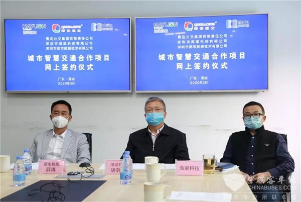 为全面落实青岛市委、市政府关于疫情防控期间抓好“双招双引”,积极开展网上招商活动的工作部署,3月17日下午,青岛市国资委举行2020年春季重点招商项目第二轮网上签约活动。其中,青岛公交集团与深圳市海梁科技有限公司、深圳市都市数据技术有限公司签订三方合作协议,共同开启城市智慧交通合作项目,不断提升城市公共交通信息化、智能化运营管理水平,打造国内领先的城市公交智慧体系,建设引领公交运营发展的“青岛模式”。