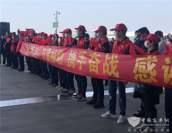欢送现场,不论是医护人员还是公交志愿者,大家的泪水都忍不住在眼眶里打转。一个多月的朝夕相处,我们虽然不知道彼此的名字,甚至都没有看清楚对方的模样,但我们知道,执甲而来的白衣天使是武汉人民的英雄,而公交人24小时的默默等候付出,也架起了武汉人民与医护人员共同抗疫的心桥。“武汉是一座美丽的城市,希望儿子可以考上武大,每年可以来看樱花。”一位医护人员在登机前依依不舍地向欢送他们的志愿者挥手,向难忘的大武汉告别。