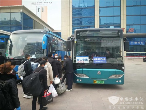 眼下,随着疫情防控形势逐渐好转,社会开始复工复产,一队党支部在原有定制公交陆续恢复的基础上,主动联系山东信达建设工程有限公司,为返济农民工提供公交出行服务。3月12日下午3:00,30余名来自重庆的农民工从专列下车登上了“复工专线”公交车,50分钟后,到达目的地,下火车上汽车直达企业驻地,无缝链接,实现了专列专车的点对点接送服务。