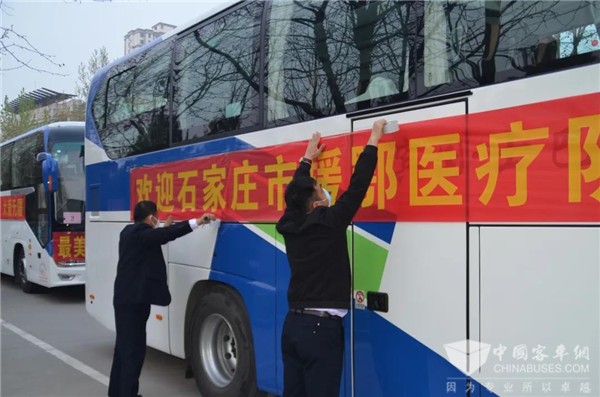 车辆出发前一天,新干线客运公司对参加运送的车辆开展“地毯式”大扫除,车头悬挂“新干线欢迎援鄂英雄凯旋”的横幅,车身悬挂“不负重托,不辱使命,凯旋归来!”“白衣执甲破楼兰,英雄凯旋平安还”等横幅 。