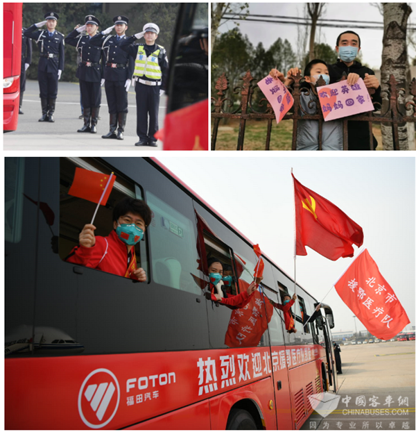 根据北京市支援湖北医疗队离汉返京保障工作的总体安排,北京公交集团负责援鄂医疗队一行150人抵京后的接机转运和驻地服务任务,其中转运车辆全部由北汽集团提供。