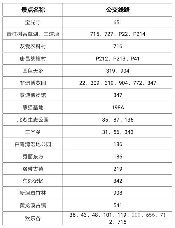 2020年4月4日起,成都公交集团将开行17条假日专线,方便市民及游客前往熊猫基地、杜甫草堂、武侯祠(锦里)、清水河公园、翠湖梨乡、黄龙溪古镇、空港花田、天府芙蓉园、天府熊猫塔、东郊记忆、幸福梅林、秀丽东方、白鹭湾湿地公园、北湖生态公园、东门市井、动物园、欢乐谷、凤凰山公园、漫花庄园等景点,加快建设美丽宜居公园城市,助力成都国际消费中心城市,打造“三城三都城”城市品牌贡献更多公交力量。