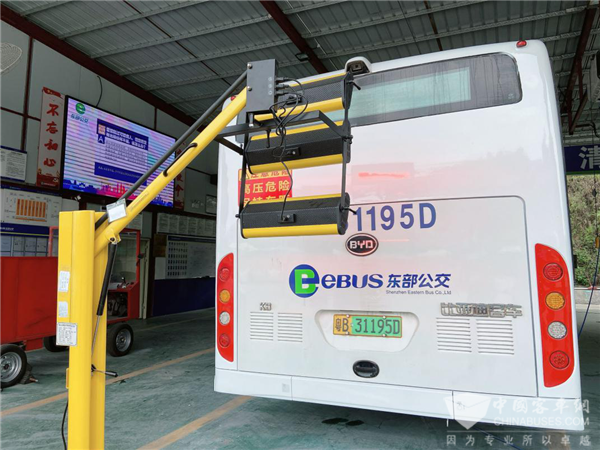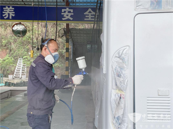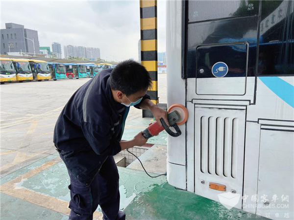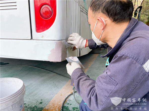 近日,深圳市东部公交七分公司甘坑车间的“美容师”们,采用水性环保漆及调温红外线烤漆灯等新购设备,对承修车辆的车身外观进行了修复“美容”。