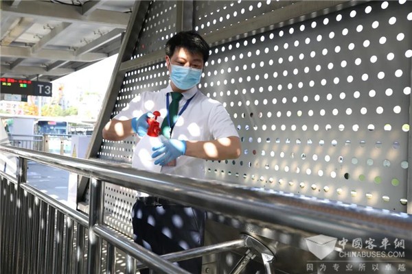 BRT站台工作人员对入闸口和候车区扶手消毒站台电子显示屏、广播循环滚动播放防疫提醒,工作人员定岗定点引导乘客扫码、测体温,监督员在站台内不间断地巡查。18日下午,在武昌火车站东广场BRT站台,长江日报记者看到这样一套严格的公交防疫措施。