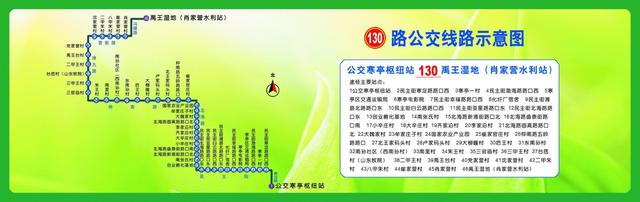 130路从公交寒亭枢纽站发车,经寒浞路-民主街-北海路-仲南路-潍九路-营前路-冯横路至禹王湿地(肖家营水利站);下行线沿途设置46处站点,上行线沿途设置46处站点,公交寒亭枢纽站首班6:40,末班16:40,禹王湿地(肖家营水利站)首班8:30,末班18:20;实行阶梯票价,半程2元,全程4元,IC卡成人卡享受全程票价八折优惠,学生卡享受全程票价七折优惠。