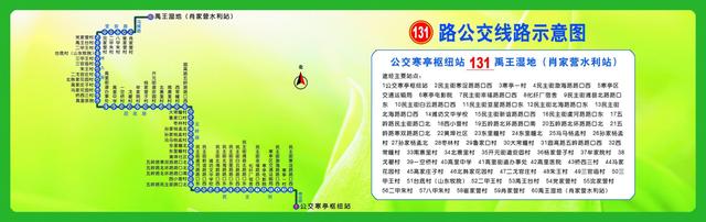 131路从公交寒亭枢纽站发车,经寒浞路-民主街-五岭路-固高路-潍九路-营前路-冯横路至禹王湿地(肖家营水利站);下行线沿途设置60处站点,上行线沿途设置59处站点,公交寒亭枢纽站首班6:00,末班15:50,禹王湿地(肖家营水利站)首班7:40,末班17:40;实行阶梯票价,半程2元,全程4元,IC卡成人卡享受全程票价八折优惠,学生卡享受全程票价七折优惠。