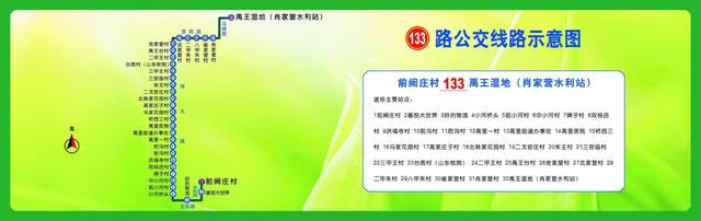 133路从前阙庄村发车,经长松路-北环路-潍九路-营前路-冯横路至禹王湿地(肖家营水利站);下行线沿途设置32处站点,上行线沿途设置32处站点,前阙庄村首班6:00,末班17:00,禹王湿地(肖家营水利站)首班7:15,末班18:30;实行阶梯票价,半程1元,全程2元,执行季节票价,IC卡成人卡享受全程票价八折优惠,学生卡享受全程票价七折优惠。