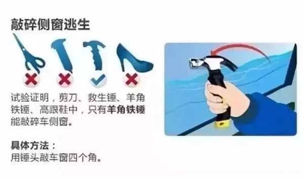 玻璃破碎后会随水流迅速冲进车内,一定要小心避免玻璃划伤。逃出车外后要保持面部朝上,游出水面后迅速寻求救援,如果不会游泳在离开车前尽量找一些漂浮物抱住。