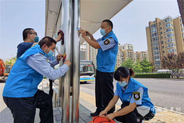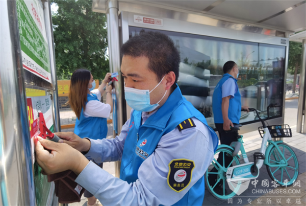 41路途经王府井、天坛、欢乐谷等城市标志性地段,为了给乘客营造整洁、舒适的乘车环境,车队组建了志愿者服务突击队,深入沿线站台对各类小广告进行全面彻底的清理。记者在北京华侨城公交站看到,志愿者们身穿蓝马甲,提着小水桶,拿着刷子、铲子等工具,对站台内的护栏、站牌以及一些广告牌上乱张贴的“牛皮癣”进行清理。有些难以擦掉的地方,大家先用水将“牛皮癣”泡软,再用小铲子铲,争取做到不留死角。