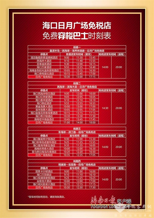 据了解,此次免费穿梭巴士的路线途径盈滨半岛、西海岸、东海岸、观澜湖等海口四大酒店集结区,包括海口万豪酒店、香格里拉酒店、喜来登酒店、希尔顿酒店、丽思卡尔顿酒店等多家高端度假型酒店。首班最早9:00从酒店发车,一天三趟,旅客自由选择出行时间,最晚20:00从日月广场免税店启程返回,班次多、选择空间大,为广大旅客预留了充足的买买买购物时间。
