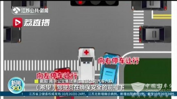 南京公交集团第四客运公司35路驾驶员曹阳阳说:“我停在三股道中间的那股道。我是第一辆车,看到红灯还有二十多秒,我从后视镜看到一辆救护车,它的灯一闪一闪的,拉着警报。我心想它可能比较着急吧,公交车比较大,往旁边拐也不行。如果我一直在那边等,当时红灯还有十几秒。如果救人,每一秒都很宝贵。所以我当机立断,确保安全的情况下,闯红灯拐到右边,让救护车走我后方开过去。”
