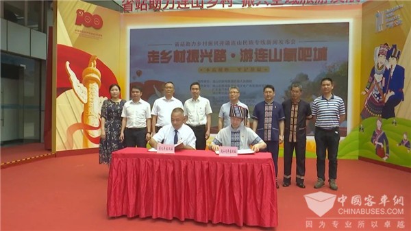 4月13日上午,广州至连山“乡村文旅专线”新闻发布会在浓郁的壮瑶风情节目中拉开序幕,省汽车客运站和粤运连山站代表进行签约,标志着省站发出的第一班少数民族特色文旅专线巴士正式开通。