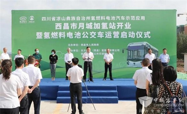 2021年6月2日,在西部高原腹地,邛海之畔的凉山州西昌市,由东方电气集团东方锅炉股份有限公司参与投建营的标准化固定式加氢站投运,初期示范配套的10辆燃料电池公交车启动运营。
