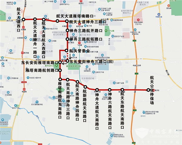去程由航天保养场发车,经航天南路、雁塔南路、航天中路、神舟三路、航天大道至航天大道西口;回程由航天大道西口发车,经航天大道、神舟三路、东长安街、雁塔南路、航天南路至航天保养场。线路长度10.5公里。首班6:30,末班19:30,实行无人售票空调车投币两元可刷卡票制。