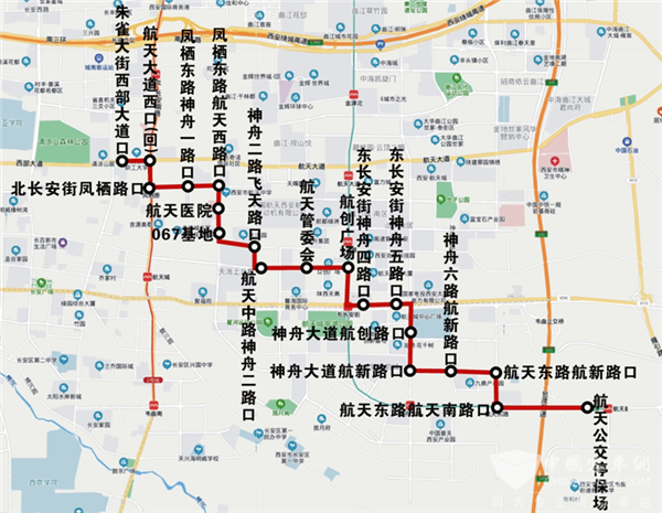 由航天保养场发车,经航天南路、航天东路、航新路、京东大道、东长安街、神舟四路、航天中路、神舟二路、飞天路、航天西路、凤栖东路、北长安街、西部大道至朱雀大街西部大道口。线路长度11.5公里。首班6:00,末班24:00,实行无人售票空调车投币两元可刷卡票制。