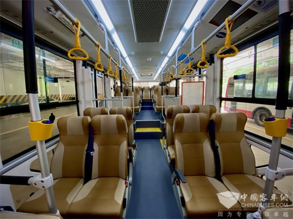 在车辆内部细节处理上,在多个方面同样能体现银隆新能源独特的“用心”之处,车上座椅从传统硬制塑料座椅改成仿皮材质,座椅上还增加了扶手和安全带;座椅靠背角度可自行调节,提升乘坐舒适度;座椅背后设置有杯架、小桌板以及舒适的脚踏;公交车内还在前排扶手,每排座椅下部加装了USB接口,方便充电的乘客使用。这些满满的小细节都大大提升了乘客的幸福感。