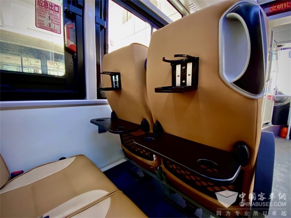 黄色的皮质桌椅,后背倾斜度还可以自主调节,座位配有小桌板、杯架、脚踏板,车内还有USB接口……踏上新车,记者发现这辆车的内饰明显升级。