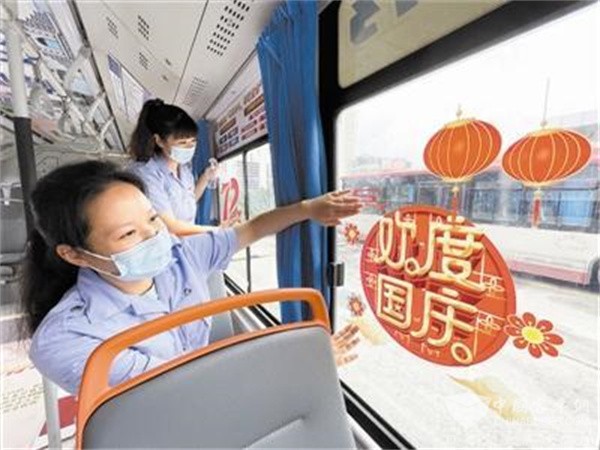 国庆节临近,公交8路打造了“欢度国庆”主题车厢,车厢两侧车窗贴有“华诞72周年”“我爱中国”等字样的窗花,让市民乘客能够感受到节日气氛。