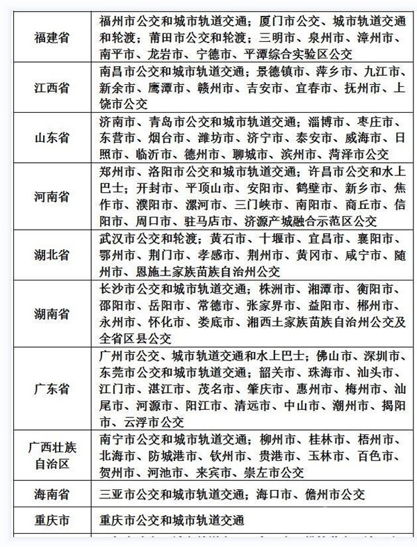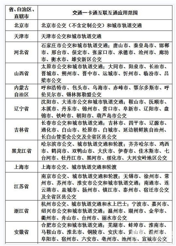 全国交通一卡通互联互通城市列表
