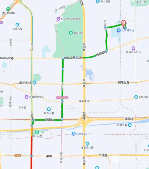 一、线路路由您可选择在建国路、大望路、金台路、甜水园街、朝阳公园南路、姚家园路、星火西路沿线站点上下车。