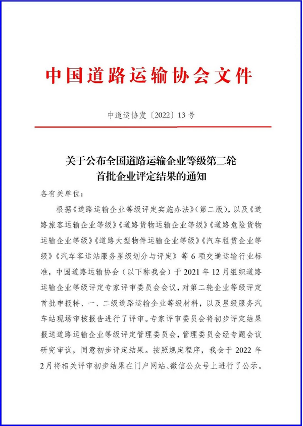 2020年底,全国道路运输企业等级第二轮评定工作启动,中国道路运输协会(以下简称本会)在行业主管部门的指导和帮助下,在各级道路运输协会的支持和配合下,在广大道路运输企业的响应和参与下,历经一年多的时间,顺利完成第二轮首批评定全部工作。2022年4月16日,全国道路运输企业等级第二轮首批评定结果正式发布,首批25家全国道路运输特级企业(含一级汽车租赁企业、 五星级客运站)脱颖而出。