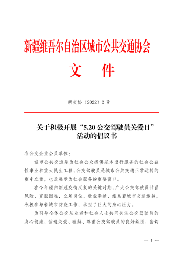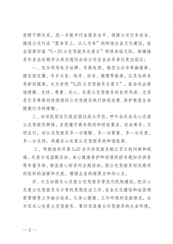 为引导全体公交从业者和社会人士共同关注公交驾驶员的身心健康,营造关爱、理解、尊重公交驾驶员的良好氛围,密切党群干群关系,进一步提升行业服务水平、保障公交行车安全、推进公交行业“服务至上,以人为本”的和谐企业文化建设,在全国第四届“5·20公交驾驶员关爱日”即将来临之际,新疆维吾尔自治区城市公共交通协会向公交企业会员单位发出倡议: