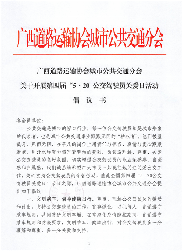 广西道路运输协会城市公共交通分会关于开展第四届“5·20公交驾驶员关爱日活动倡议书
