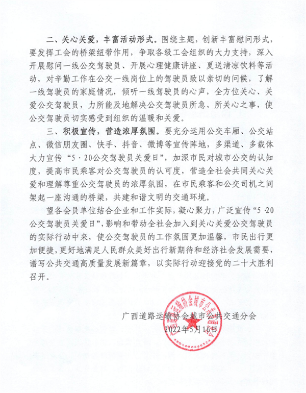 广西公交协会倡议:积极开展“5.20公交驾驶员关爱日”活动