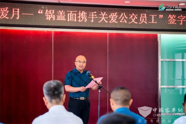 镇江公交有限公司总经理凌建锋作了热情洋溢的致辞,他代表镇江公交全体职工,向镇江市锅盖面协会及其热情支持的各家餐饮公司给予公交员工的关心关爱,表示衷心的感谢!并表示,今年5月20日,镇江公交第六届“5.20公交驾驶员关爱日”活动继续举办,希望社会各界、广大市民和乘客朋友们能够踊跃参与,向公交驾驶员送上“爱心卡”和节日祝福。
