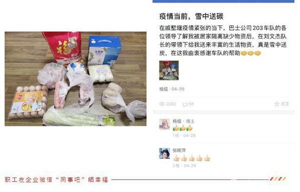 4月下旬,我市经开区疫情防控形势严峻,为保障职工居家隔离期间的生活需求,4月29日,巴士公司203车队购买了蔬菜、肉类、大米等生活物资,送到2名居家隔离职工所在社区,嘱托大家要继续严格落实疫情防控措施,做好自我保护工作。