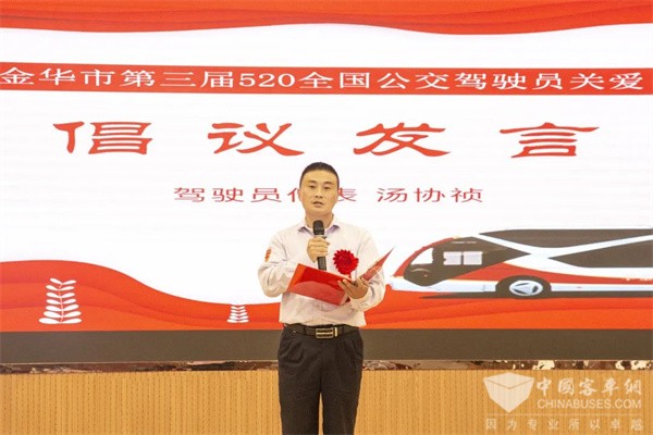 驾驶员代表汤协祯发出关爱公交驾驶员倡议,呼吁尊重、理解公交驾驶员,共同守护车厢文明;承诺会把社会各界及广大市民的关爱化为文明行车、优质服务的动力,共建安全、便捷、优质、文明、和谐的公交出行环境,向党的二十大献礼。