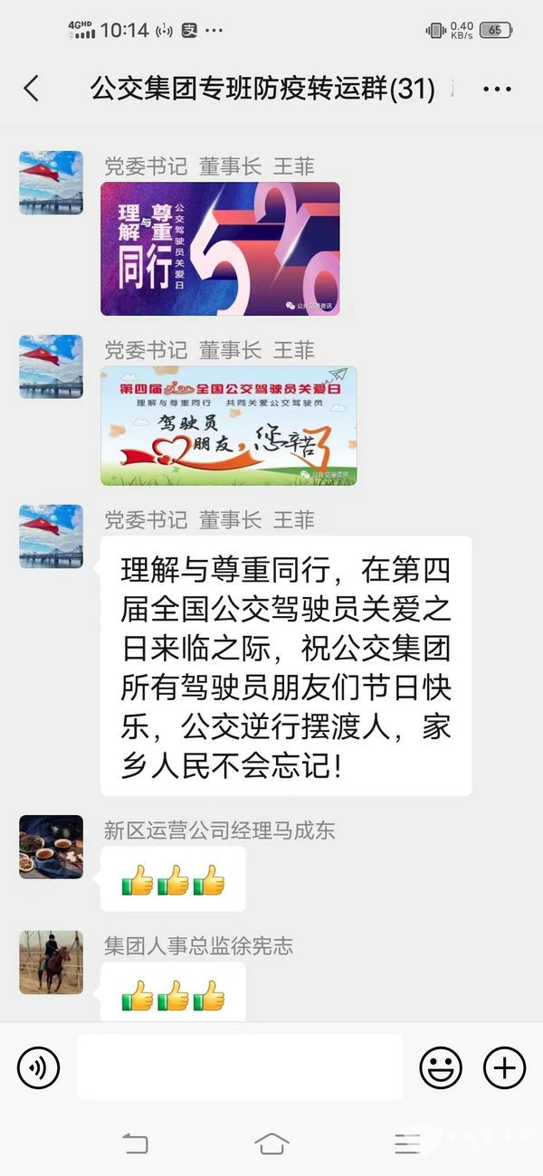 5月20日当天,公交集团党委领导通过“公交集团专班防疫转运群”传达至各个工作群向所有公交职工和家属,特别是奋战在抗“疫”一线,执行转运工作的公交驾驶员致以亲切的节日问候和美好祝愿。