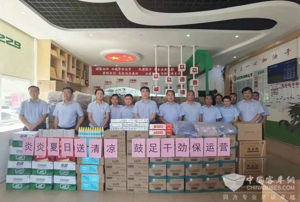 在刘庄站点、省体修理车间,集团公司党委副书记、总经理宋霖一行向连日来战高温、抗疫情、保运营立足岗位辛勤付出的职工们表示感谢,对公交人不畏酷暑的坚守奉献精神给予高度赞扬。同时将集团公司工会购置的果汁、清凉油、驱蚊水、香皂、毛巾等物品送至每一位职工手中,让职工深切感受到集团公司的关心关爱。