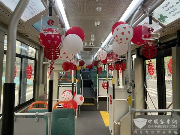 车身、车窗上贴着吉祥的红双囍,车厢内,张挂着五彩缤纷的气球以及国风双囍挂件,公交婚车简约又不失喜庆、简单又不失风格,驾驶员邵洪林也早早整装待发等候新人。