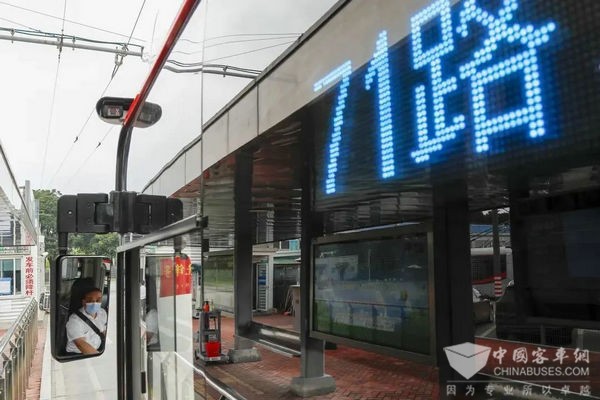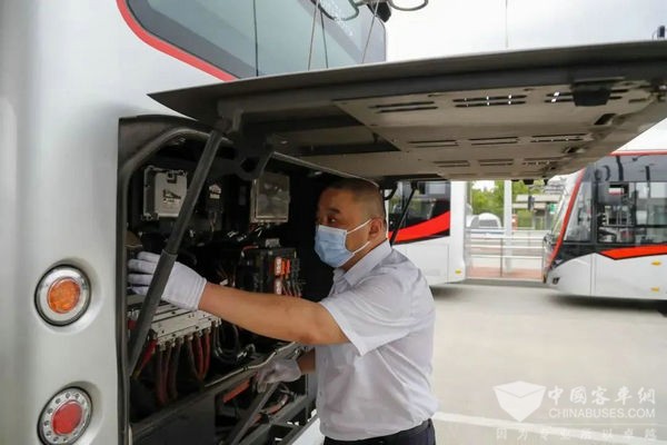 张津晟是中运量71路的一名公交驾驶员,自开线起,他始终坚守在一线。这天下午3点,刚到站的张津晟又开始为下一趟发车作准备。“夏天是车子出故障的高发期,所以一般发车前,我们都要先检查一下车尾的发动机,再看看车子的‘小辫子(集电杆)’有没有松动之类的。”