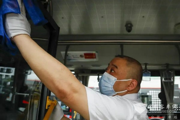 检查完毕,一上车,由于刚刚打开空调,记者明显感受到车内温度高于室外温度,连座位都能烫屁股。“上车以后,我们乘务员会对车厢内包括扶手、地面、栏杆等进行清洁消杀,我会帮忙擦干,这样配合起来会完成得快一点,确保车辆准点发车。现在因为要执行防疫要求,车辆窗户不能紧闭,特别是驾驶位边上的窗户更是必须保持开启状态。”张津晟告诉记者,为了驾驶安全,在驾驶位一侧的窗帘他是从不拉下来的,由于驾驶座经常受到阳光的直射,这使得他手臂的肤色更加黝黑。