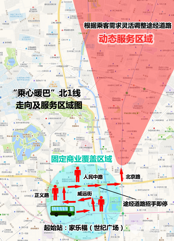 昆明公交自2022年6月21日起,在南屏街商业片区首次推出夜班定制公交专线——无固定站点、无固定走向、途径道路上见到招手即停的“乘心暖巴”。“招手即停”、“点对点服务”、“直达到家”这些词曾经或许只存在于出租车和网约车的服务,现如今公交也可以这样为民提供服务了,从起点到终点,根据实际乘客的需求来确定走向,不仅节约了乘客下班回家的时间,还做到了精准化、定位化的服务。