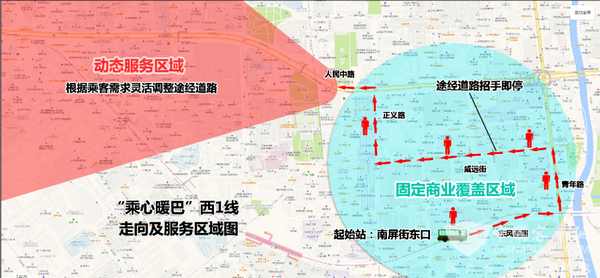“乘心暖巴”在CBD内以固定线路串联各大商场,并在固定线路中除设置相应站点外,可在确保安全的情况下招手停车,用来满足乘客便捷的乘车需求,目的地按照乘客实际需求,实现点对点、直达到家的动态定制公交服务模式。