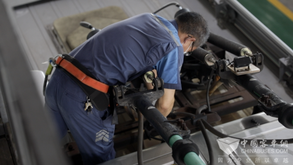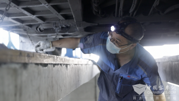 据秦立介绍,钻地沟修车是他们的日常工作,有时候为了赶进度,公交车刚熄火停进来,等不及散热他们就要钻到车底下去检查,有时候车底部件需要维修,在车下一站就是一小时。